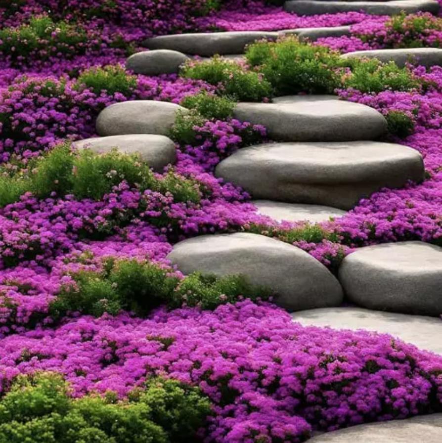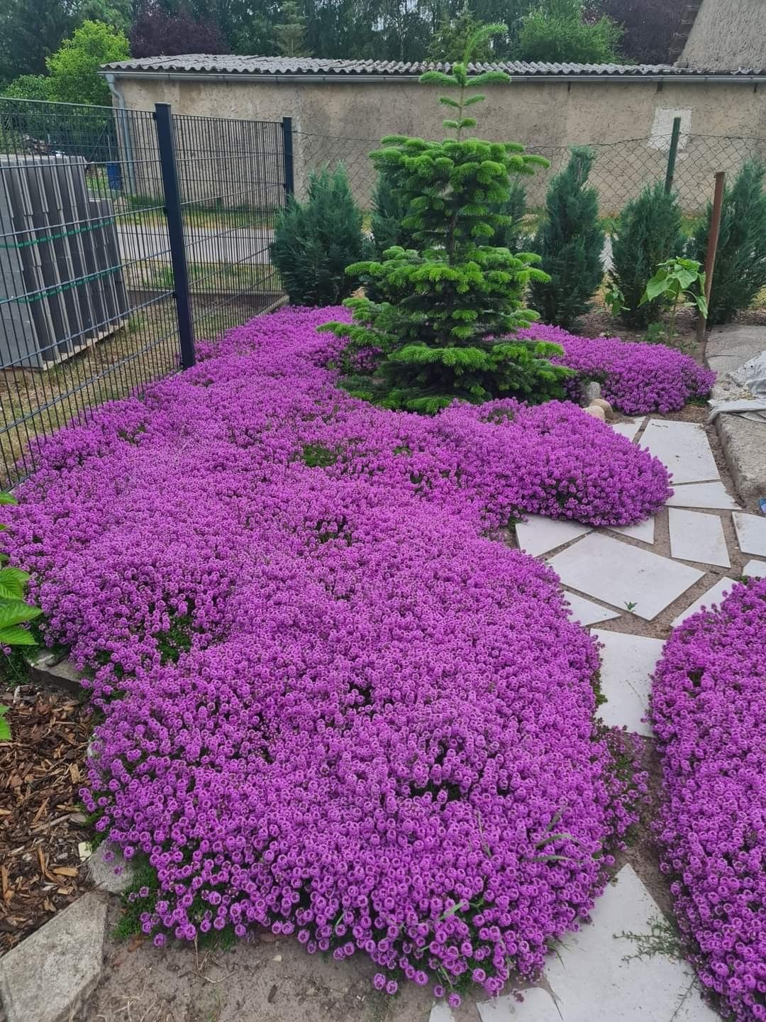 ШВИДКИЙ РІСТ: Цвітуть з травня по серпень кистями квітів білих, синіх та пурпурно-фіолетових відтінків, рослини цвітуть настільки рясно, що ви майже не можете побачити вічнозелене листя внизу. Існує дуже мало ґрунтових покривів, по яких можна ходити, але чебрець повзучий є одним із них. Він підходить як замінник газону на невеликих ділянках, ідеальний грунтовий покрив для використання між сходами або поблизу внутрішніх двориків і доріжок. Запашні квіти.